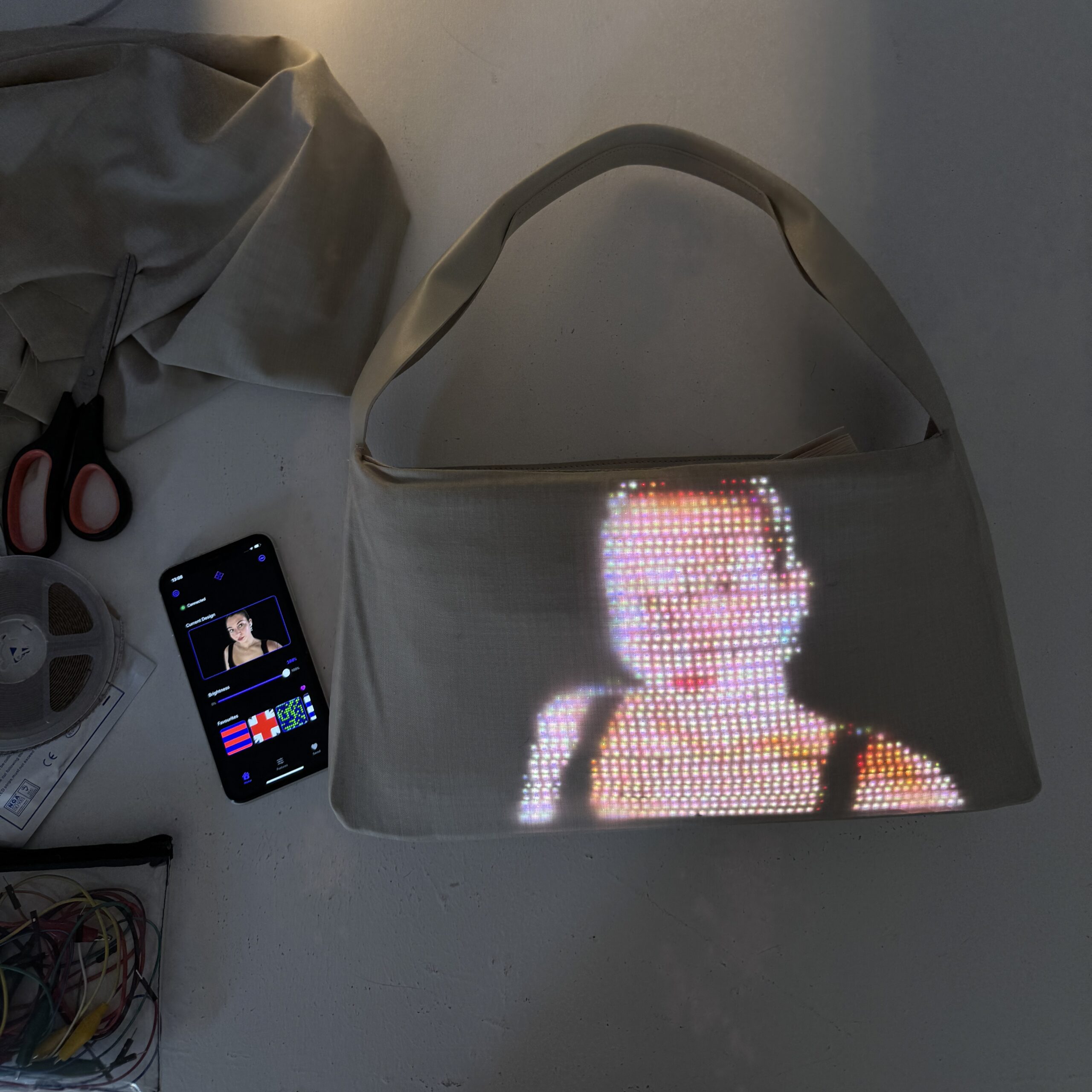 IRIS is a soft, LED-embedded bag reimagining wearable tech as a tool for self-expression, blending sustainability, interactivity, and customisation into everyday fashion. Paired with a custom-built app, it allows wearers to control patterns, colours, and media uploads in real-time.